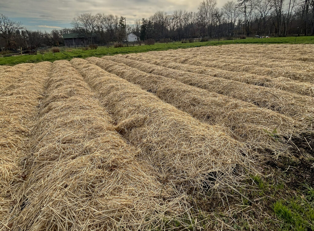 Straw mulch is spread over garden beds to shield the soil from harsh winter conditions. It helps reduce erosion, moderate soil temperature, and protect soil structure. In the spring, the straw is raked off and reused throughout the farm until it naturally breaks down. Once it’s no longer effective as mulch, it becomes part of our compost system—continuing its role in building healthy soil. Straw is especially useful for beds that remain in production later into the fall.