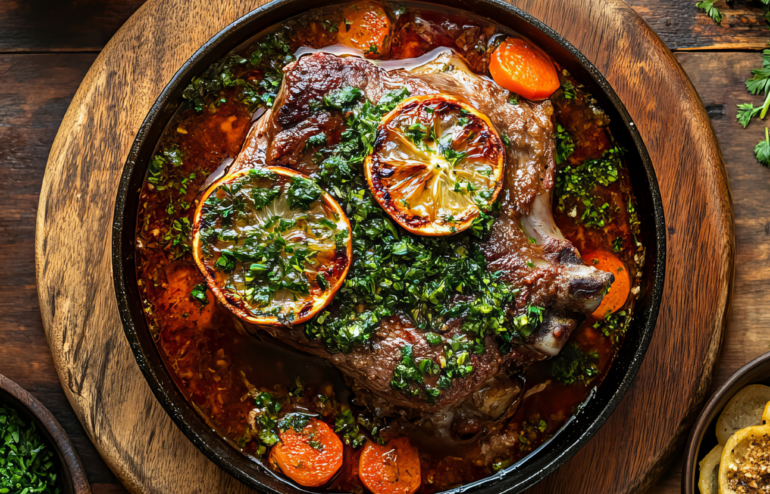 This traditional osso buco brings out the full richness of beef shank through slow braising and layered flavors. The meat is seared, then simmered with vegetables, red wine, tomatoes, and fresh herbs until fork-tender. The result is a deeply savory, comforting dish with a rich sauce, perfect for serving over pasta, mashed potatoes, or rice.